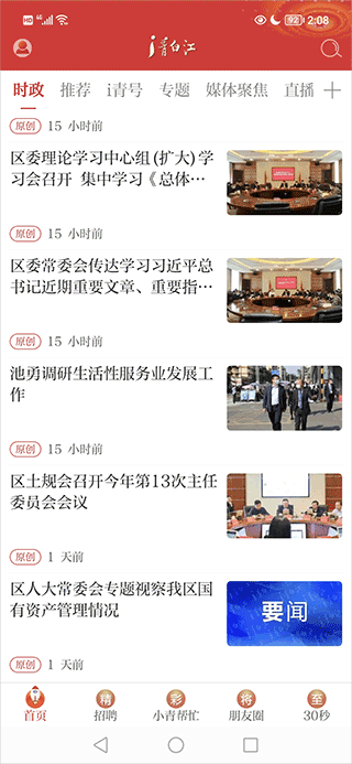 i青白江app是一款专为大众设计的资讯软件,提供新闻、招聘、视频等多种信息。首页有丰富的时政和媒体新闻,还有招聘信息和用户互动功能。朋友圈和30秒栏目让用户体验更丰富。