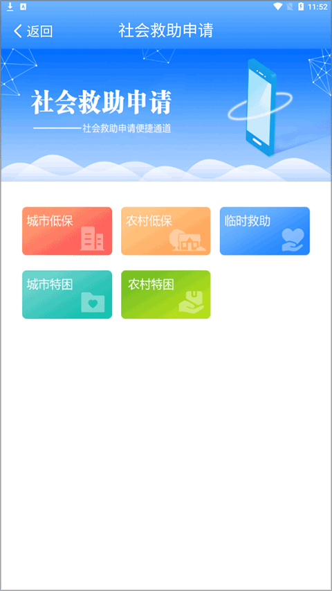 1、进入软件主页面,点击低保查询。进入之后点击临时救助。