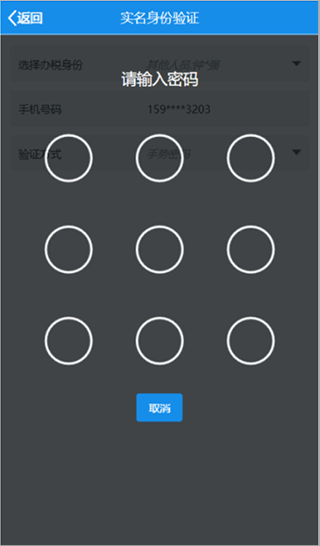 手势密码验证:选择办税身份验证用户后输入其对应手势密码验证,验证通过即成功登录。
