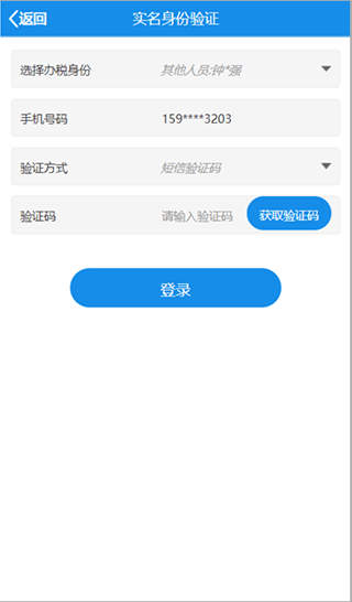 短信验证码验证:选择办税身份验证用户后点击【获取手机验证码】并输入后点击【登录】,验证通过后即成功登录。