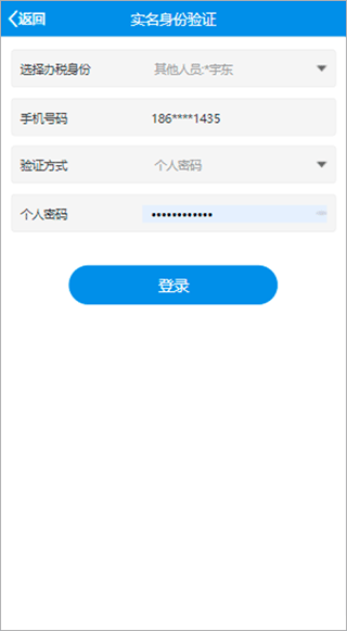 个人密码验证:选择办税身份验证用户后输入其对应密码后点击【登录】,验证通过即成功登录。