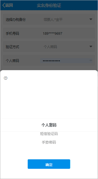 2、选择办税身份验证用户名及验证方式,验证方式包括个人密码、短信验证码和手势密码。