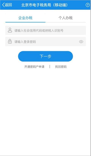1、点击【企业】办税输入社会信用代码或纳税人识别号及企业密码,点击【下一步】。