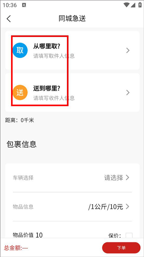 4、信息填写好之后,用户还需要填写包裹信息,包括急送车辆、物品信息、物品价值、取件时间、配送方式、支付方式等,点击下单即可等待骑手接单配送。
