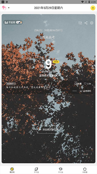 让我觉得特别贴心的是它的社区功能,可以和全国各地的考生交流经验、互相鼓励。尤其是“励志金句”和“早起百人榜”,这些都能激励大家坚持努力。软件还可以设置桌面小应用,随时提醒学习时间,这个设计真的很实用。