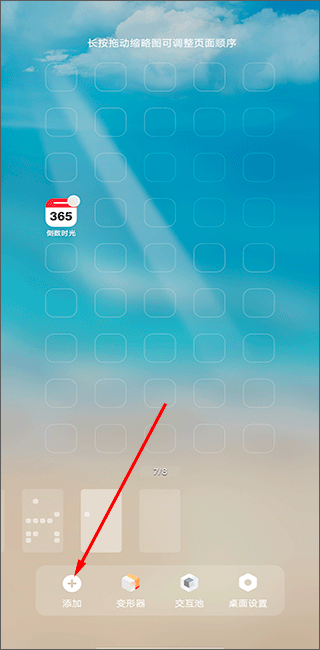 1、在桌面长按或双指捏合空白区域(部分华为或者OPPO等手机是双指捏合方式)找到“添加”按钮;