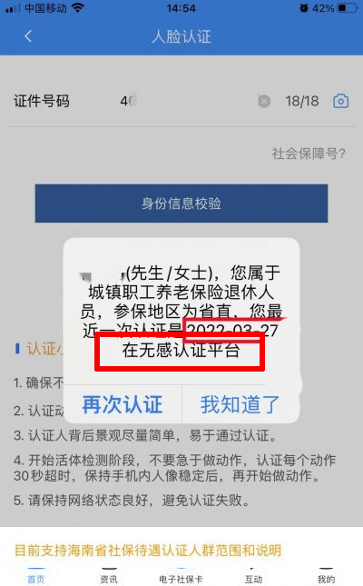 认证成功后,或者已完成认证时就可以出现以下页面了。如果该页面还出现“无感认证平台”的文本,那是告知用户可能最近打过疫苗,或者坐过飞机或动车,或者有进出海南岛记录等等,这些人员活动轨迹信息已经通过大数据共享到国家社保数据中心了,这样也视同用户已完成认证了