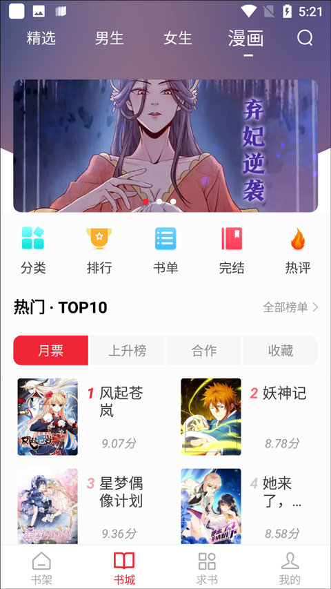 1、下载软件打开,点击书城栏目,选择漫画界面在这里里可以查找各种分类、排行的漫画