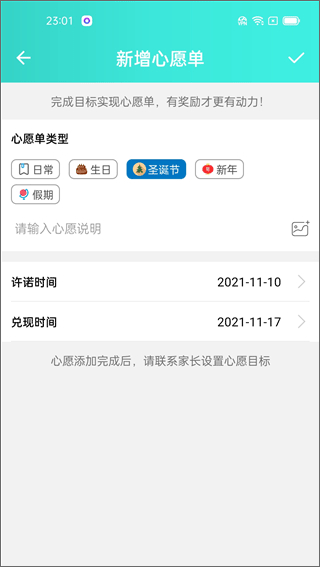 4、点击新增加心意单,孩子可以设置心意单类型,许诺时间和兑换时间,有奖励孩子才会有动力。
