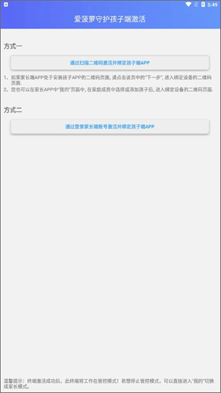 1、下载安装好爱菠萝守护孩子端后,需要扫描家长端app的二维码进行绑定激活;