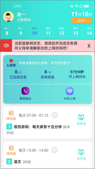 2、完成绑定后,孩子就可以在这里查看父母设置的每日任务,完成任务可以领取上网时长;