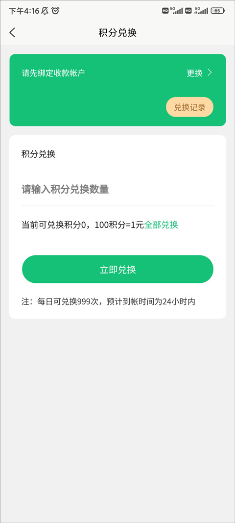 点击右下角“我的”进入个人主页,点击“积分兑换”按钮进入到提现页面。