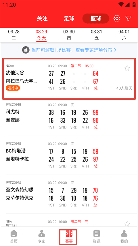1、打开应用,在赛事一栏中找到并点击红色方框内的赛事选项,进行中的比赛观看起来更加直接;
