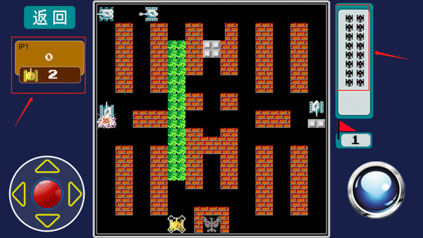 3、地图中分布了很多坦克,而你需要保护你的老鹰不被攻击的同时并将这些坦克消灭掉,敌方坦克和你都有几次重生的机会,左边自己坦克的生命系次数,右边白色框框内为敌方坦克生命次数,没消灭一个坦克框内就会减少以此机会