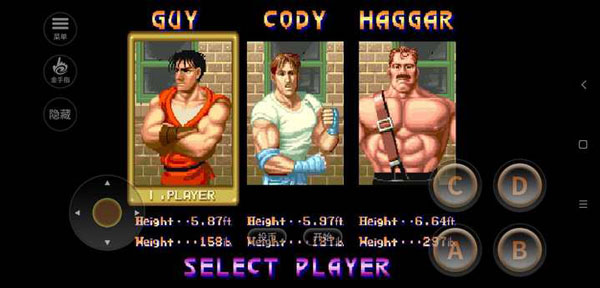 游戏中共有三位角色,分别为白色的科迪、红色的凯以及大力士哈格,除了通用技能外,还有各自的特色技能。通用技能 必杀:J+K
