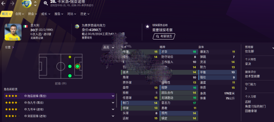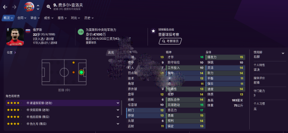 身体稍差,对于开档中下游球队来说 应该算的上好用的伪9 或者拖后,工作投入只有10。