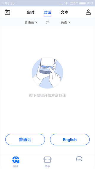 4、点击“对话”,软件进入实时对话界面,点击界面下方“普通话”则可以直接说出普通话,软件自动翻译成英文并可以语音播报。点击界面下方“English”则可以直接说出英文,软件自动翻译成中文并可以语音播报。点击“英语”标志也可以切换其他语言。小编亲测,识别度高,和国外友人交流再也不用担心了。
