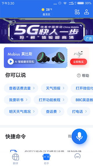 6、点击软件界面下方“助手”,软件则会进入语音智能工具,点击右下角”麦克风“标志,即可对软件直接说出你想要的需求,例如”打开微信“、”打电话“、”天气预报“等功能,相当于一个功能强大的智能机器人,好用又有趣。
