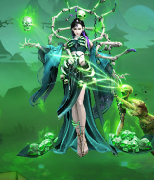 触发技能:白骨蚀毒(白骨夫人使用蜈蚣鞭攻击敌人,造成325%攻击+1500的伤害,10%概率追加毒伤,每秒造成15%神将攻击的伤害,持续5秒)