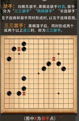 白棋无禁手,黑棋走禁手判负,禁手分为,三三禁手,四四禁手。长连禁手 三三禁手;黑棋落子后,同时形成两个或者以上活三时,称为三三禁手。