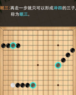 再走一步就可以形成冲四的三子,称为眠三