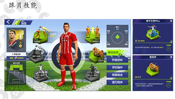 光有高阶的评价还不够,球员还要给自己升级属性。例如罗纳尔多的定点射门和游戏对战属性,可以通过训练来进行提升,提升后的球员抢断、射门和传球等属性都会更加强大,在赛场上能以属性优势领先你的对手!所以技能属性的升级进阶非常重要,各位玩家感觉自己不够强的话,一定要去升级一下球员的技能属性哦!