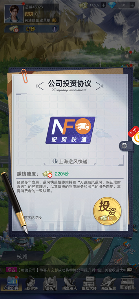 3、我们看下一个任务,下一个任务是让我们投资上海逆风快递,点击上海进行投资;
