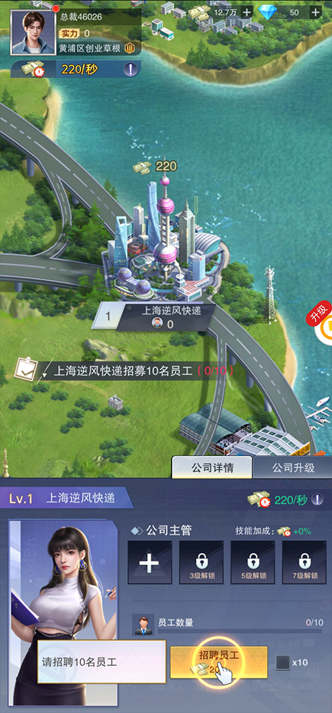 4、投资之后,需要为快递公司招募10名员工,点击十下就招募好了;