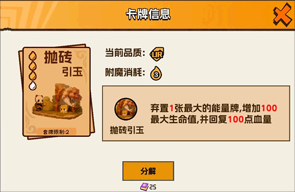 未雨绸缪可以使自己在下回合少摸能量卡时要弃置一张牌,启动有延迟,不过也不失为一张好用的卡牌。而星火则是0费附魔还能获得1附魔点,相当于稳过一牌还赚一点,不过有能力的小伙伴也能试试换成例如如意(ur)等能获得附魔点的牌。