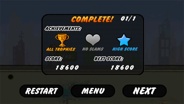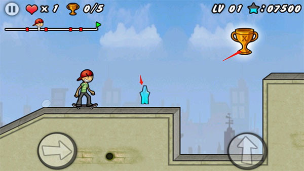 滑板少年游戏是一款趣味十足的冒险闯关类手游,游戏玩法简单有趣,玩家需要控制一名滑板少年通过加速、跳跃等操作在空中完成各种各样的动作,去收集关卡中提供的金币以及奖杯,最后通过终点即可通过关卡。