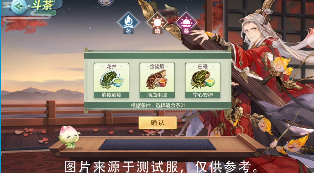 通过判断“季节”、“天气”、“昼夜”等条件因素选择合适的茶品,并通过控制“泡茶时间”力求为随机武将呈上浓淡相宜的茶品,即可获取评分对应的活动货币「茶晶」与元宝奖励!