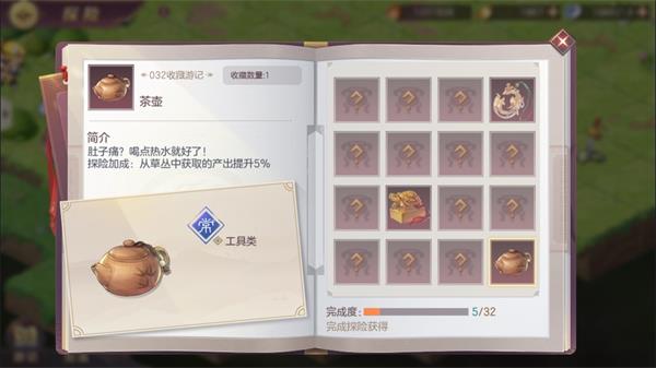 随着探险次数的增多,会在探险中获得一些收藏品,这些收藏品将稳定提升探险中的收益,具体可在【游记】-【收藏品】中查看