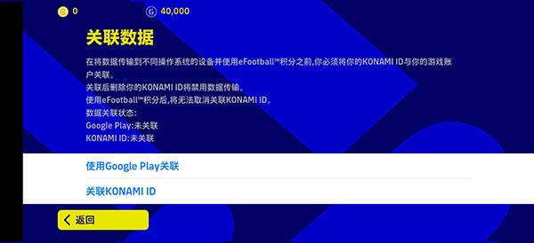 3、里面会有个关联数据,玩家如果已经绑定了谷歌账号后,建议重新谷歌商店登录个谷歌账号,或者绑定科乐美账号。