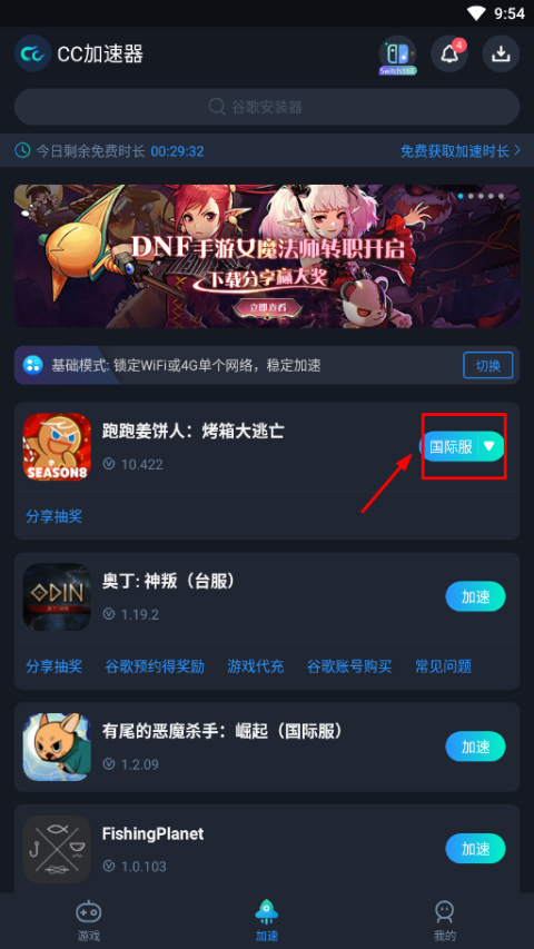 1、打开CC加速器,然后找到跑跑姜饼人官方版,选择要加速的服务器,包括国际服和港服;