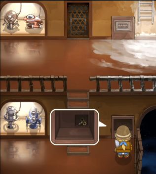 第五步,来到右上方,将小车推向左侧后,来到第二格铁轨,也就是水下机关的正上方,使用带绳子的钩子勾起机关,此时左上方会冒出一个暗格。