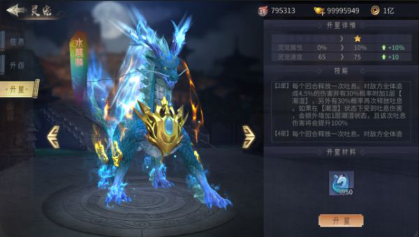 玩家通过参与灵宠试炼获得灵宠和御宠石,积累御宠石可以兑换更高级的灵宠和灵宠培养材料,消耗对应的培养材料可以对灵宠进行升级和升星,提高属性和获得灵宠技能效果