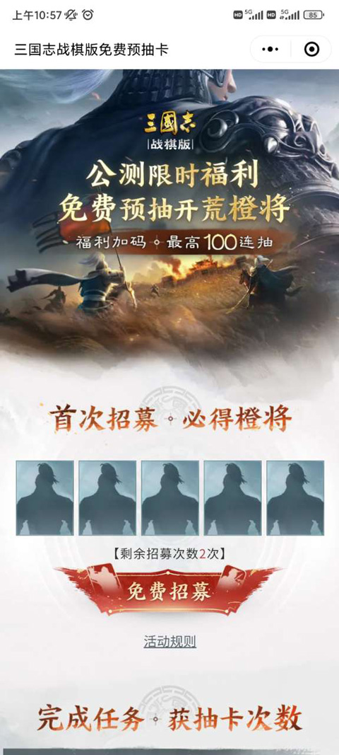 通过微信小程序或者公众号可以参与,每日在线抽卡获得橙卡和紫卡,可以在活动期间兑换,在游戏开测后即可获得对应武将。