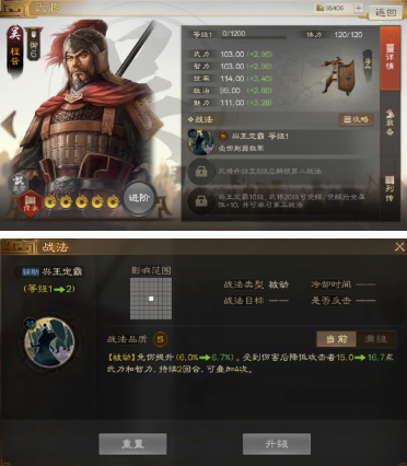 同样是填空题,程普作为毫无疑问的前排肉盾武将,自带战法【兴王定霸】在自己受伤后削弱敌军。很显然,他最适合的打法套路就是战法牧稳健流,作为绝对稳健的前排抗伤害武将。