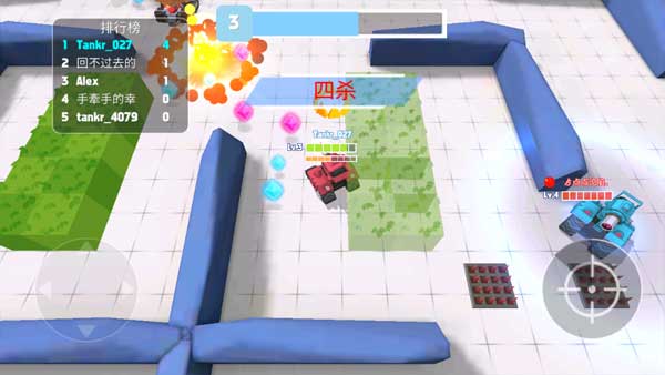 2、玩家需要通过控制左边的摇杆来移动坦克,在移动的过程中需要吃蓝水晶来增加能量和经验值。