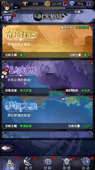玩家进入游戏后,可以在主页面中看到,包括主城,伙伴,冒险等各种不同的活动页面,在主城页面可以看到共鸣魔晶地点活动,进入可查询详细内容和挑战。