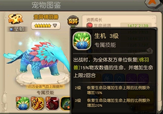 锦羽兽的技能相当实用,全场加血两千多堪比一个奶妈的作用,而且因为需要加力量属性来提高奶量,输出也不差,推荐加点4力1耐(体)加点,推荐技能:吸血、强壮、顽强(重生)、光明、抵抗等(特殊作用辅助宠都应该以生存为第一要务)