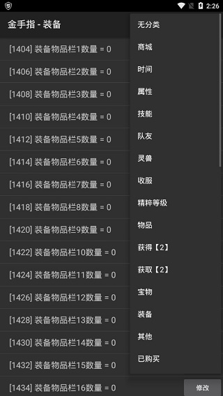 此刻会进入金手指界面,在这里有着多种分类属性修改,在对应的【修改】中输入你要修改的数值,即可获取大量资源。