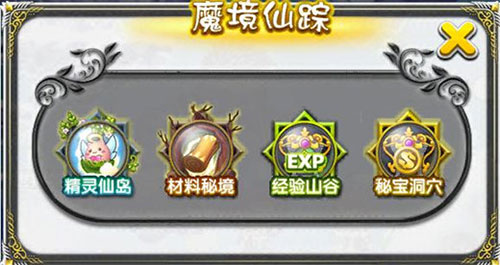 当玩家等级达到25级后,“魔境仙踪”玩法会自动开启。当中共有四大秘境,分别为:精灵仙岛,材料秘境,经验仙谷,秘宝洞穴。小伙伴们从字面上不难看出,四大秘境分别针对精灵、材料、经验、秘宝四块内容向玩家开放福利,但每天可进行挑战的次数是有限的。每个秘境在挑战难度上都有普通和困难之分,不同难度获得的物品数量和等级也是不同的。