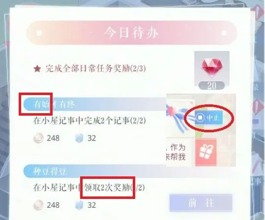 3、在小屋记事中完成2个记事:强调“始”,只要放卡,就算一次,可以马上点击“中止”来完成一次,同样方法完成第二次,不需要等到领一次奖励之后再做。