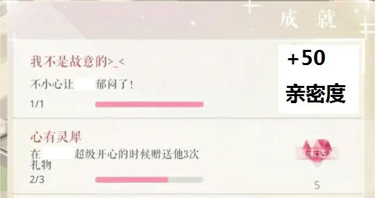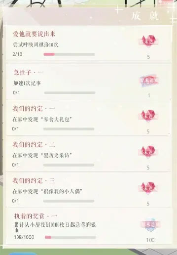 3、四男主每人都有三个“我们的约定”成就,其中的物品均可增加亲密度200,物品出现随机,不要心急。