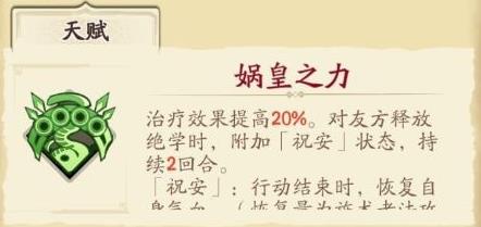 葛云衣在被玩家获得后,还会拥有一个名为神气流转的技能,这个技能是一个群体加血技能,并且会驱散一个负面状态。这个技能和葛云衣的娲皇之力配合,让葛云衣在群体加血上,有着非常不俗的实力,成为队伍治疗的绝对保证。