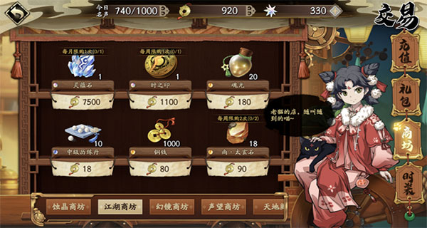 然后就是需要花费游戏里的一定资源,我们可以每周都在江湖商坊,幻境商坊以及天地阁的商店中购买总计四个时之印。