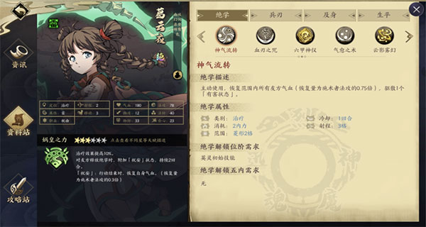 葛云衣身为拥有女娲一丝灵识的角色,她独特绝学是娲皇之力,可以通过对友方施加绝学后给予持续两回合的祝由状态,使友方在行动结束后,恢复基于葛云衣法攻的回复量。这一个特性,让葛云衣在游戏中治疗量十足,可以胜任绝大多数关卡。