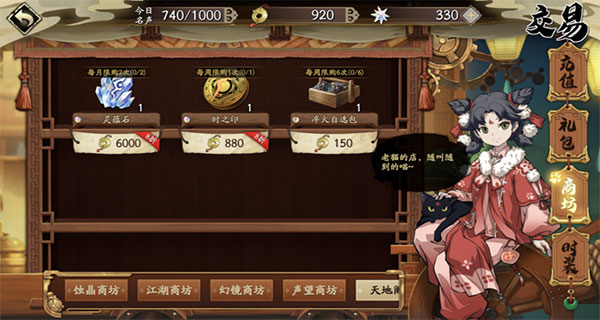 然后就是需要花费游戏里的一定资源,我们可以每周都在江湖商坊,幻境商坊以及天地阁的商店中购买总计四个时之印。