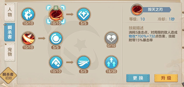 瞬杀者修炼加满,暴击伤害对瞬杀者相当重要;毁灭之刃加满10/5,AOE与暴击,也是核心技能;剑刃乱舞进阶加满10/5,续航与伤害提升;蓄势待发与反手连环加满,依旧是增加伤害与续航能力。其他的点数都加全属性。